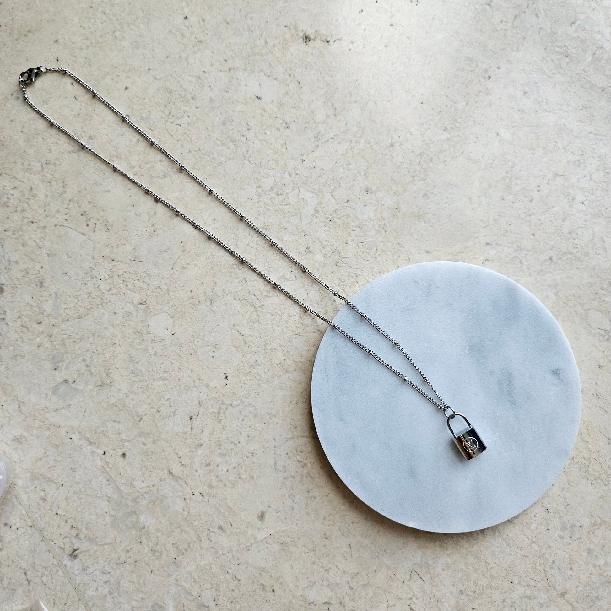 Unlock your inner fashionista with our Dainty LV Lock Necklace in 45cm dainty beaded chain. This elegant silver piece features a delicate LV lock charm that adds a touch of luxury to any outfit. Elevate your style and show off your love for iconic fashion with this stunning accessory!