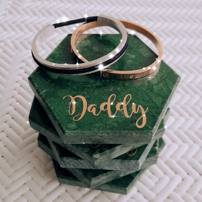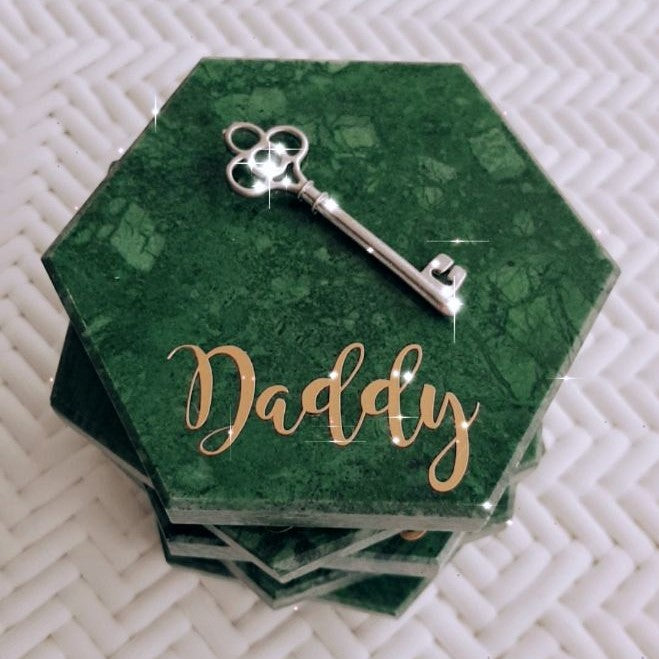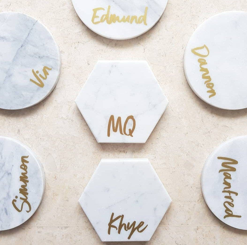 Great as a gift on any occasion, an add-on to your gift package, or a little self-indulgence in any season. Adds style and additional protection to your table setting with our solid marble coaster. These drink coasters will work beautifully with any room décor. Wording and font is fixed as gold and italic respectively, as seen in the photos above.